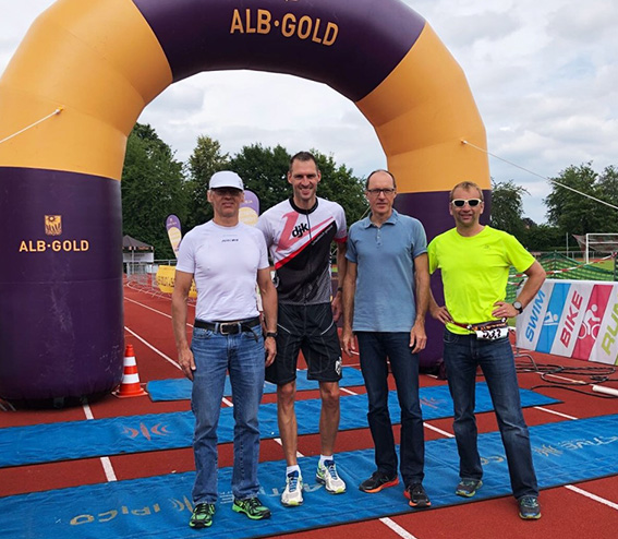 Am vergangenen Wochenende konnte sich die Triathleten der DJK Schwäbisch Gmünd weiter steigern und sprangen über die olympische Distanz in Erbach auf das Treppchen. Eine überragende Leistung lieferte dabei Thomas Waibel ab, der sich erstmals unter den Top Ten platzieren konnte und in der Einzelwertung auf Platz 6 landete. Schon vor dem Start am frühen morgen gab es einen kleinen Schock, der Baggersee in Erbach hatte 22 Grad, mit der Konsequenz, dass ohne Neprenanzug auf die 1500m Schwimmstrecke gegangen werden musste. Wie sich aber herausstellte war dies für die Gmünder Triathleten kein Nachteil und das Quartett war nach dem Schwimmen unisono unter den Top 15 platziert. Beim Radeln legte Uli Seitler als alter Haudegen kräftig los und lieferte mit 1:12:50 Stunden über die 45 km lange leicht hügelige Radstrecke ein absolutes Topergebnis ab, am Ende reichte es für Uli für Platz 15. Auf der 10 km langen Laufstrecke schlug dann die Stunde von Thomas Waibel: in 38:41 min. machte er Platz für Platz gut und landete auf Rang 6. Nahezu gleich auf der Laufstrecke tat es ihm der zweite alte Kämpe der DJK Jörg Mayer, mit einer Zeit von 40:31 min. schob er sich auf einen guten 16. Rang nach vorne. Das erfreulich gute Gesamtergebnis wurde von Didi Kässer mit Platz 27 abgerundet.