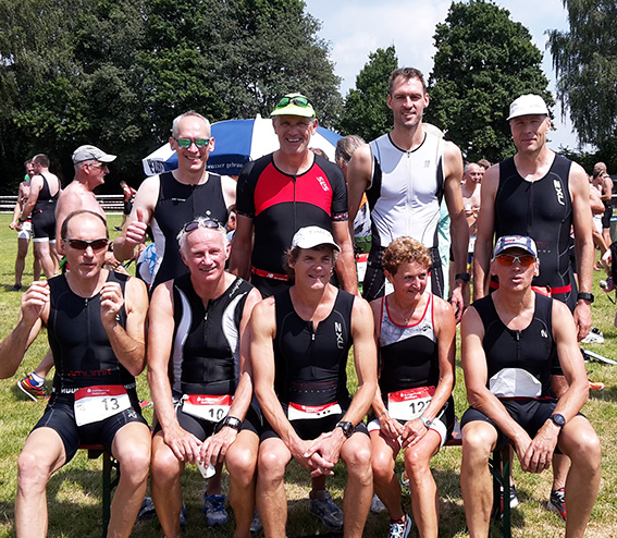 Los ging es im Aichstrutsee bei 22 Grad Wassertemperatur: warm genug für ein Neoprenverbot, was den schnellen Schwimmern etwas entgegen kam. Und der 600m lange Dreieckskurs bot den zahlreichen Zuschauern gleich ein Spektakel, gab es doch vom Start weg ein Gerangel und harte Kämpfe um die besten Ausgangspositionen beim Umrunden der zwei Bojen. Am besten meisterte die Auftaktdisziplin überraschend Dirk Häber, der sich etwas abseits des Feldes aus den Positionskämpfen heraushielt und so nach 10:25 Minuten aus dem See steigen konnte. Doch dahinter ging es knapp her und schließlich gingen Joachim Stegmaier, Edgar Maihöfer und Dirk Häber fast gleichzeitig auf die anspruchsvolle, bergige Radstrecke. Dort zündeten Thomas Waibel und Jörg Mayer den Turbo. Unwiderstehlich sammelten sie Athlet um Athlet ein und fuhren fast gemeinsam weit nach vorne im Feld. Von hinten folgte Ulrich Seitler mit einer starken Radleistung, aber etwas gehandicapt durch Knieprobleme, die ihm dann auch beim abschließenden Lauf etwas ausbremsten. Etwas weiter hinten im Feld konnten Ludwig Bertram und Holger Scholze ihren Rückstand nach dem Schwimmen etwas wettmachen und sich auf der Radstrecke ins vordere Mittelfeld der fast 300 Teilnehmer vorarbeiten.