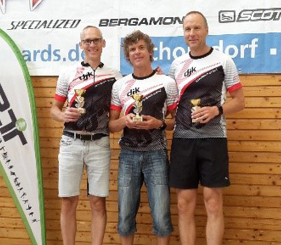 Das Podium der Altersklasse M 50 fest in der Hand der DJK Schwäbisch Gmünd: von links Joachim Stegmaier (2.), Dirk Häber(1.) und Edgar Maihöfer(3.)